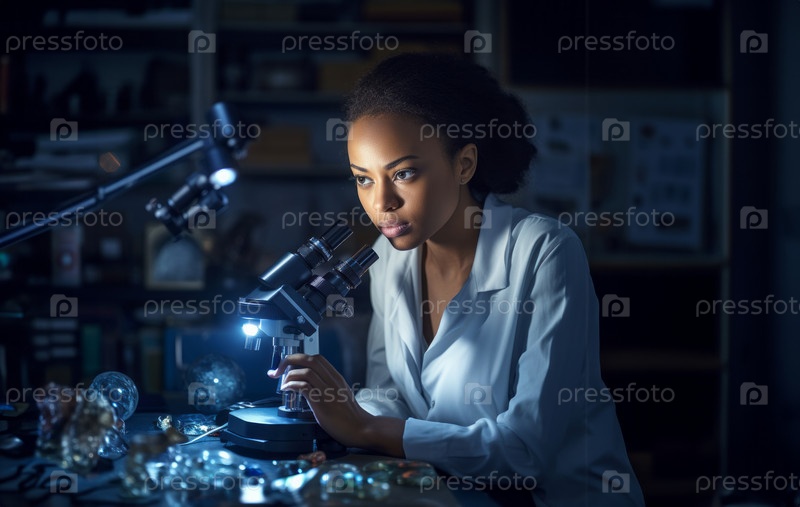 Афроамериканка-врач занимается точной научной работой, старательно используя микроскоп