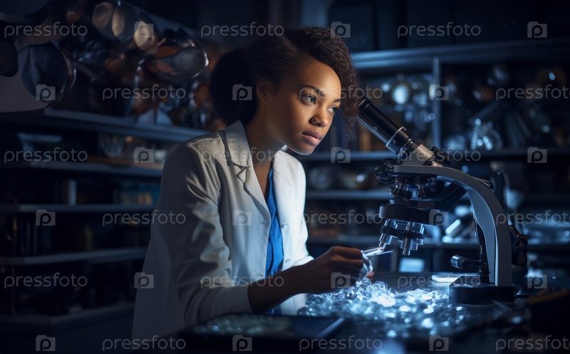 Афроамериканка-врач занимается точной научной работой, старательно используя микроскоп