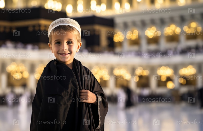 Портреты мусульманских детей в паломнических одеждах у священной Каабы, отражающие преданность и духовное единство..Сгенерированное изображение