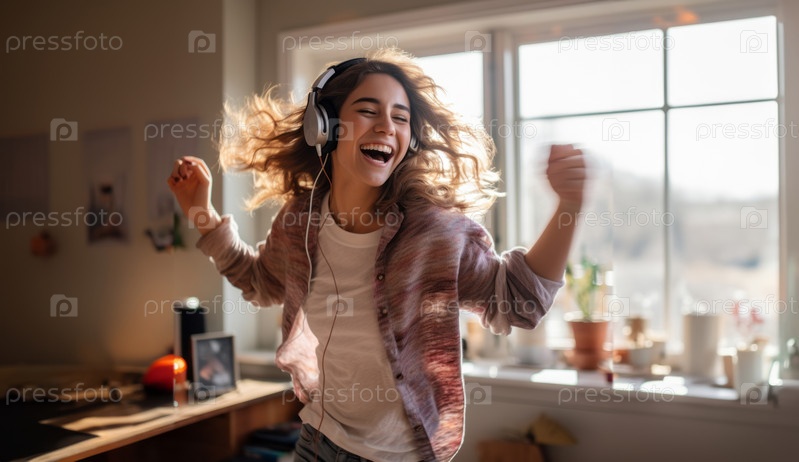 В комфорте своего современного дома стильная женщина погружается в радость музыки, надев наушники, и грациозно танцует, создавая динамичную и выразительную атмосферу в своем домашнем пространстве