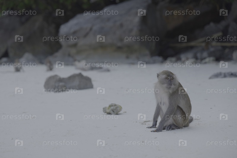 Одинокая обезьяна на пляже, наслаждающаяся мирным пейзажем посреди тропического рая