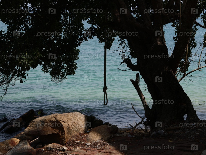 Спокойная пляжная сцена, изображающая дерево рядом с тревожным и таинственным объектом