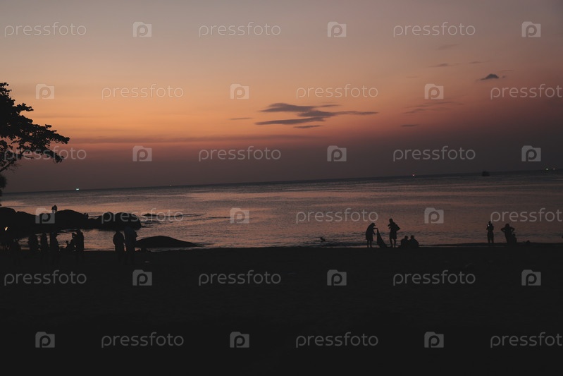 Спокойный и красивый закат на пляже с потрясающими силуэтами собравшихся людей