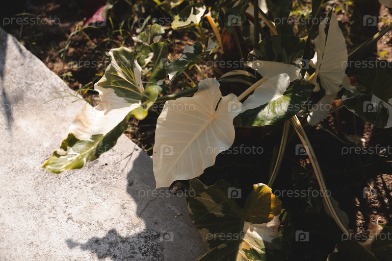 Яркие тропические листья светятся под нежным, мягким солнечным светом в живописном месте