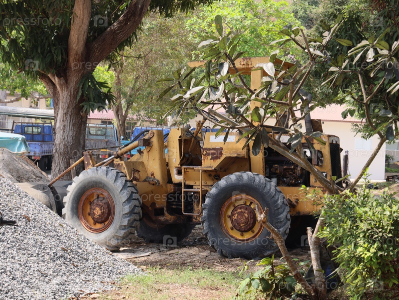 Тяжелая техника работает на строительной площадке в окружении высоких зеленых деревьев и природы