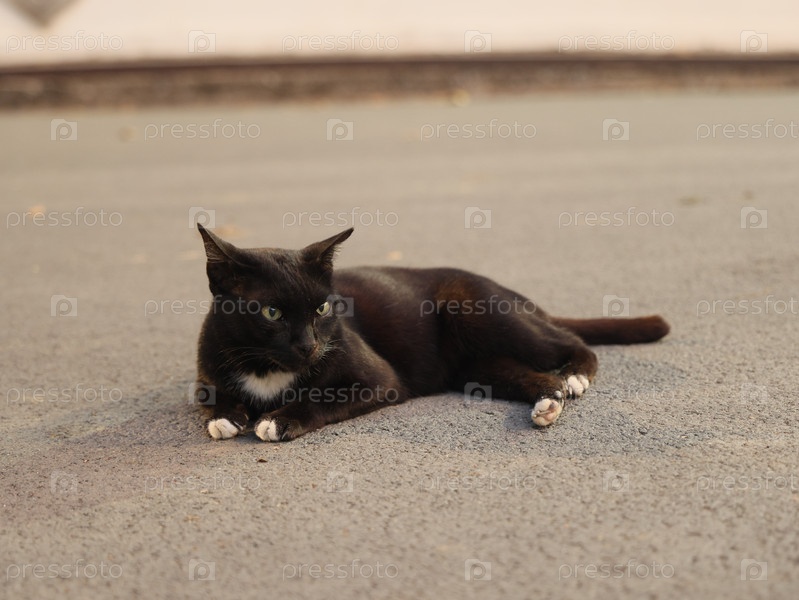 Очаровательный и милый черный кот наслаждается отдыхом на теплом асфальте снаружи