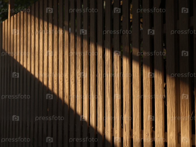 Солнечный свет отбрасывает живые тени на красивый деревянный забор в безмятежном садовом ландшафте