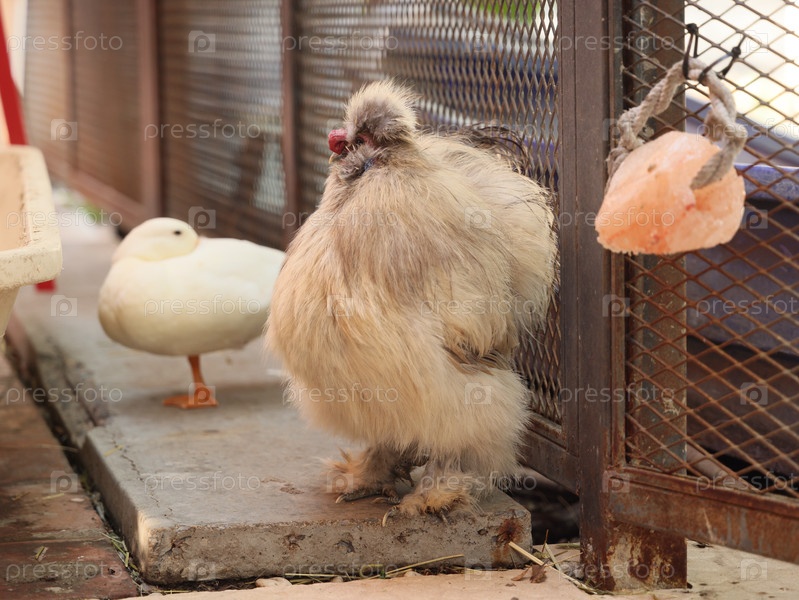 Пушистые шелковистые курица и утка уютно расположились в очаровательной фермерской обстановке, полной покоя