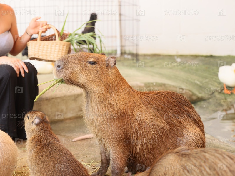 Капибары с радостью наслаждаются различными угощениями, расположившись в уютной и спокойной обстановке