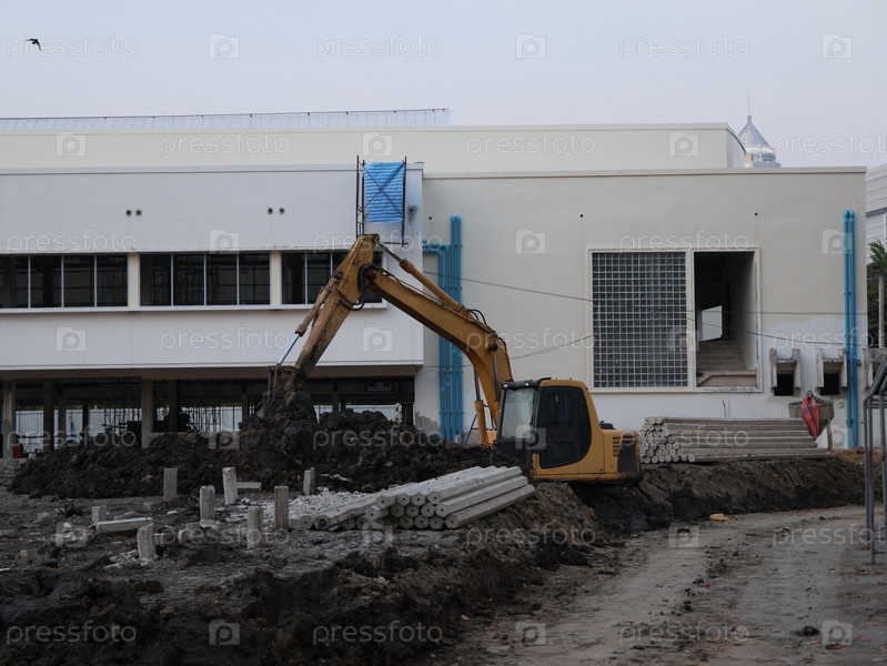 Оживленная строительная площадка, на которой тяжелая техника активно выполняет различные задачи
