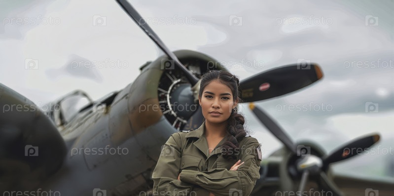 Портрет серьезной молодой женщины-летчицы в военной форме.Сгенерированное изображение