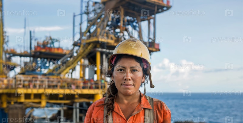 Женщина в защитном снаряжении и каске работает на строительной площадке нефтяного месторождения.Сгенерированное изображение