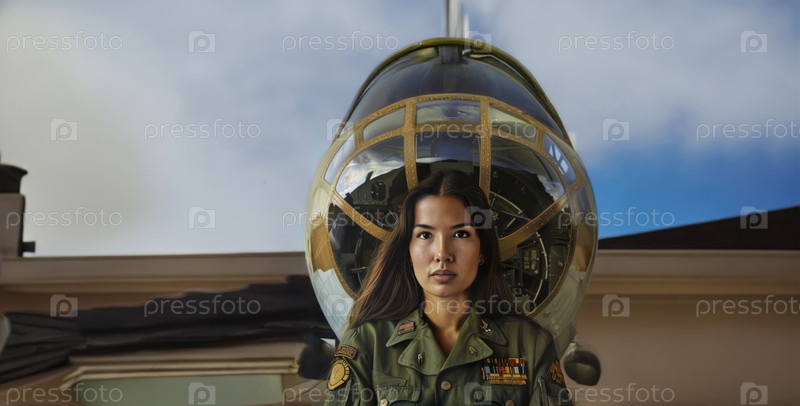Портрет серьезной молодой женщины-летчицы в военной форме.Сгенерированное изображение