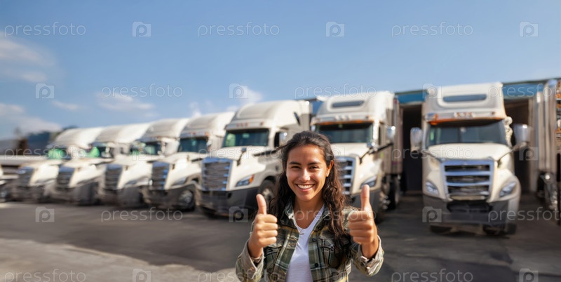 Портрет молодой женщины-водителя грузовика на фоне грузовиков.Сгенерированное изображение