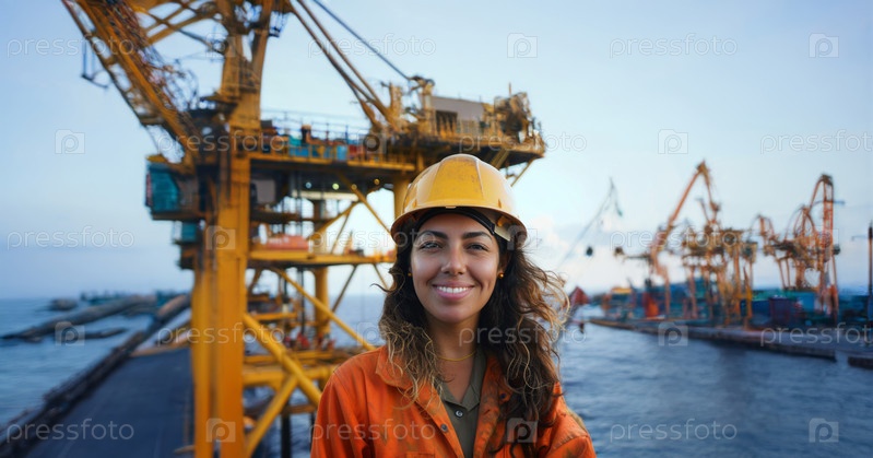 Женщина в защитном снаряжении и каске работает на строительной площадке нефтяного месторождения.Сгенерированное изображение