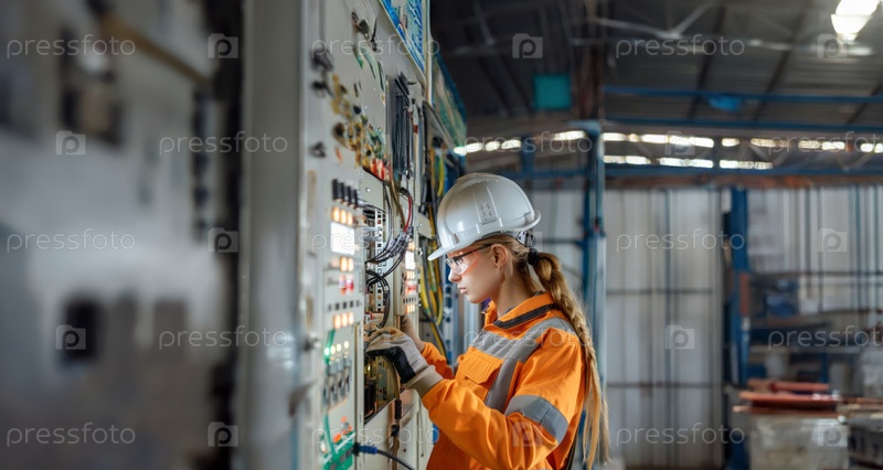 Женщина-электрик, устанавливающая системы электропитания на складе.Сгенерированное изображение