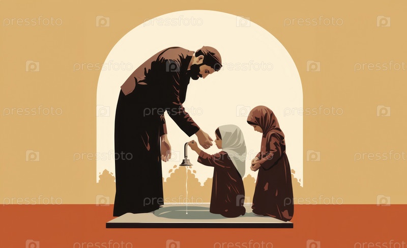 Родители обучают своих детей омовению и подготовке к исламской молитве.Сгенерированное изображение