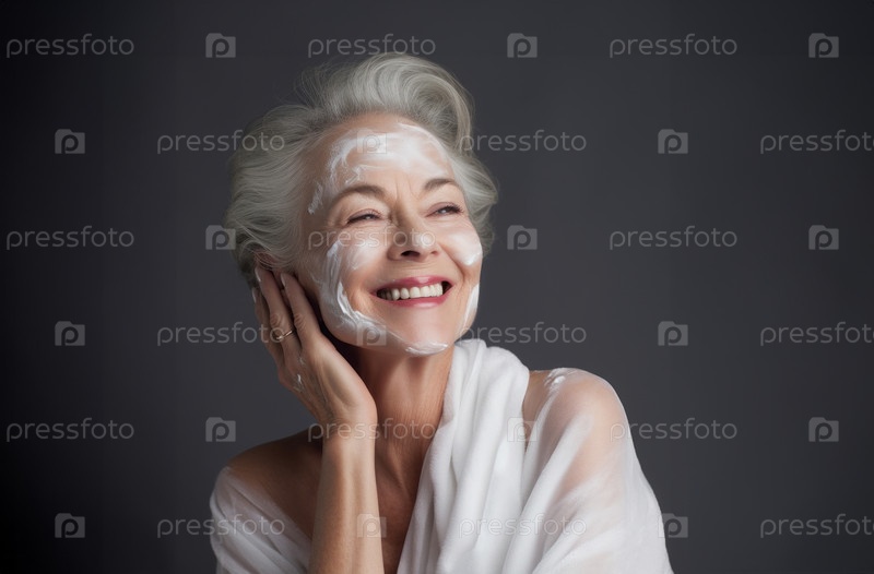 Пожилая женщина наносит крем на лицо, изящно выполняя процедуру ухода за кожей
