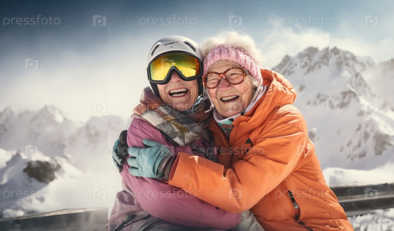 Две пожилые женщины в горнолыжном снаряжении трогательно обнимаются на заснеженной вершине горы