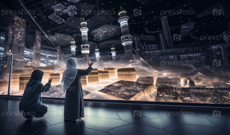 Родители показывают своим детям священные исламские места на виртуальном планшете.Сгенерированное изображение
