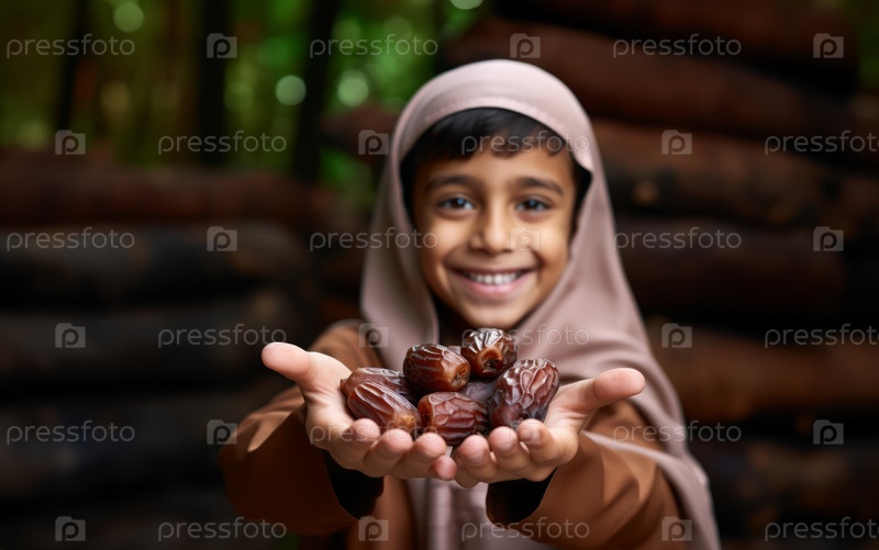 Портрет исламских детей, держащих в руках финики, символизирующие веру и традиции..Сгенерированное изображение