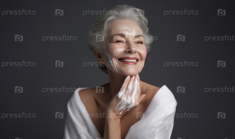 Пожилая женщина наносит крем на лицо, изящно выполняя процедуру ухода за кожей