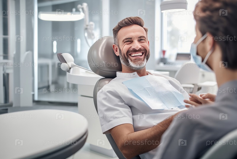 Улыбающийся мужчина в стоматологическом кресле для современного осмотра