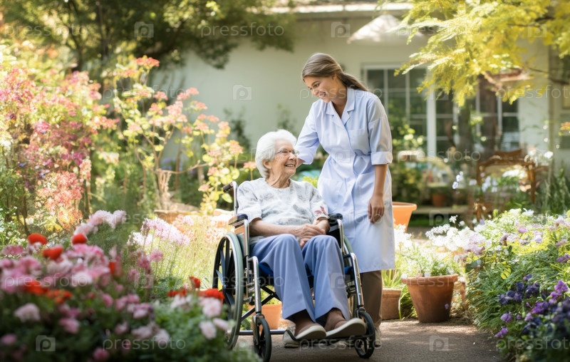 Сострадательный врач ухаживает за пожилой женщиной в инвалидной коляске, оказывая ей специализированную помощь и поддержку для улучшения самочувствия жительницы в спокойной обстановке на открытом воздухе.Сгенерированное изображение