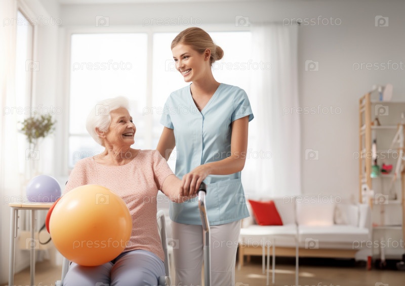 Медицинский работник выполняет лечебные упражнения с пожилой женщиной в инвалидной коляске, используя мяч и различные вспомогательные средства, демонстрируя пример сострадательного ухода и реабилитационной поддержки в сфере здравоохранения