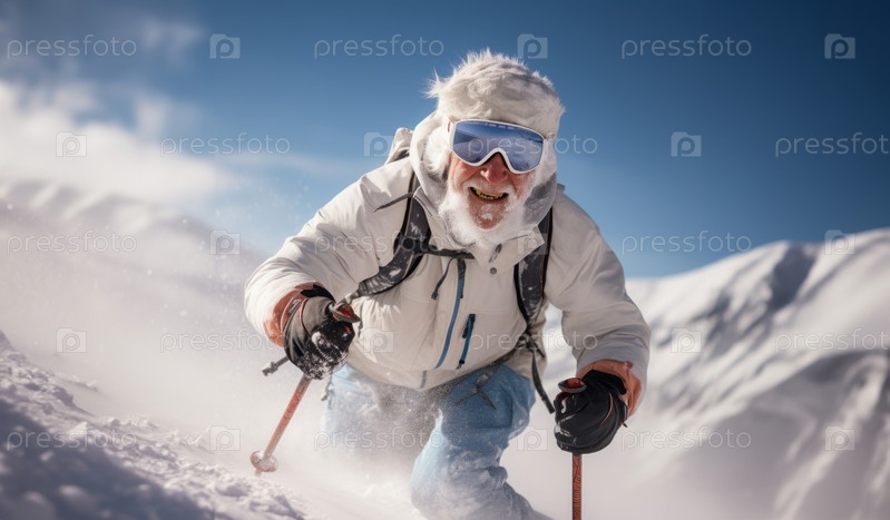 Любящий приключения пожилой мужчина с седой бородой демонстрирует свои навыки катания на лыжах на захватывающих дух заснеженных вершинах горного ландшафта