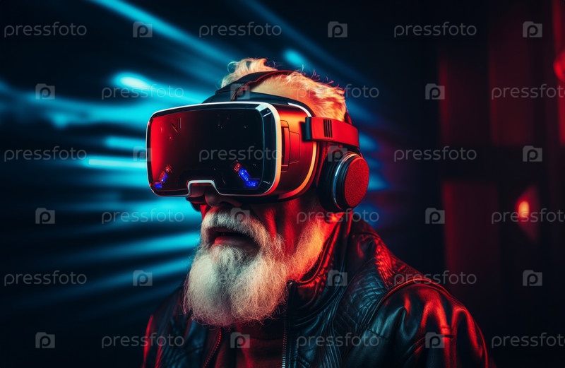 Пожилой мужчина с седой бородой погружается в виртуальную реальность, надев очки виртуальной реальности