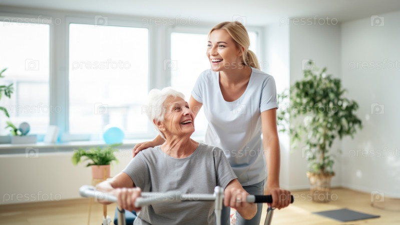 Медицинский работник выполняет лечебные упражнения с пожилой женщиной в инвалидной коляске, используя мяч и различные вспомогательные средства, демонстрируя пример сострадательного ухода и реабилитационной поддержки в сфере здравоохранения
