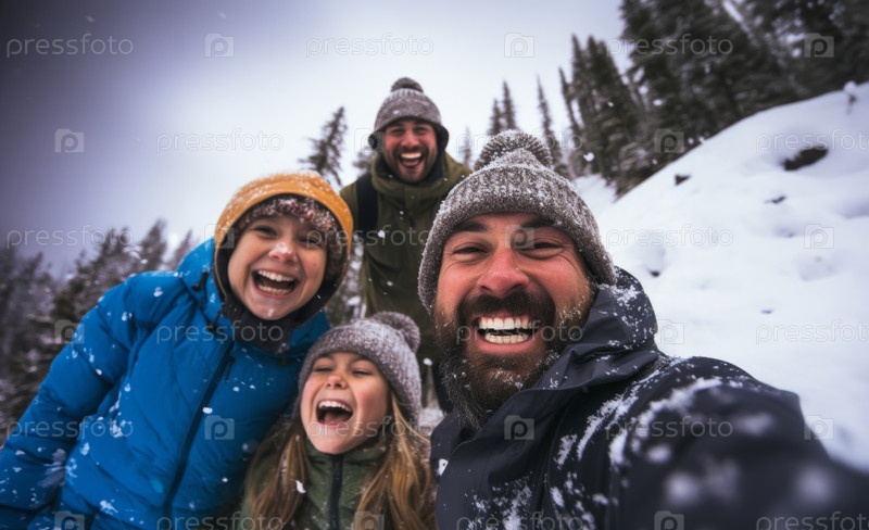 Ликующая семья запечатлела суть своих радостных зимних каникул, сделав веселое селфи на фоне заснеженного живописного горного пейзажа