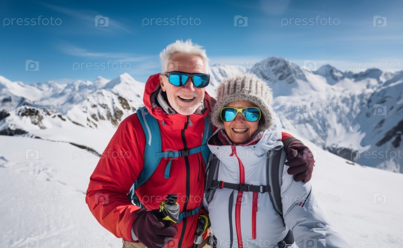 Пожилая пара в горнолыжном снаряжении разделяет трогательный момент, наслаждаясь радостью зимы и непреходящим теплом своей альпийской любви.Сгенерированное изображение
