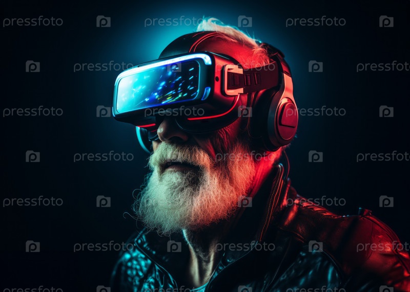Пожилой мужчина с седой бородой погружается в виртуальную реальность, надев очки виртуальной реальности