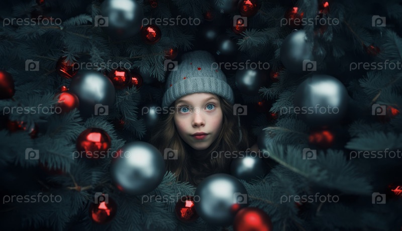 Маленькая девочка, окруженная рождественскими украшениями и красиво украшенной елкой, излучает радость и волнение в очаровательной атмосфере праздничного сезона