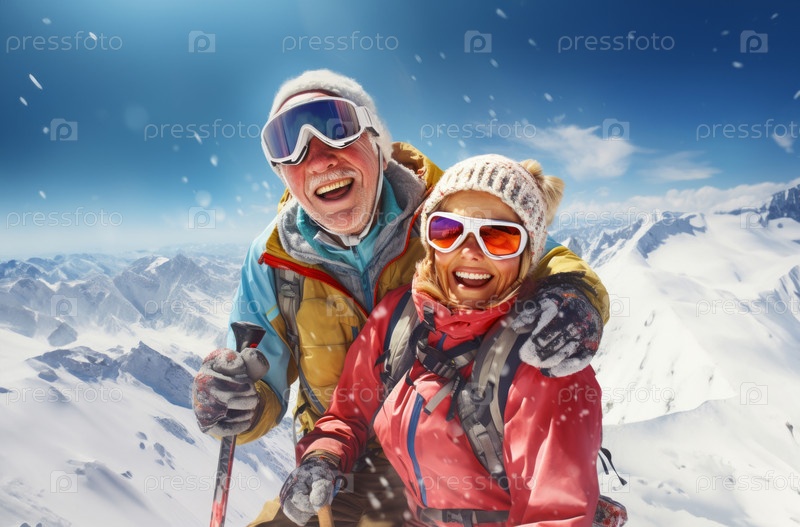 Пожилая пара в горнолыжном снаряжении разделяет трогательный момент, наслаждаясь радостью зимы и непреходящим теплом своей альпийской любви.Сгенерированное изображение