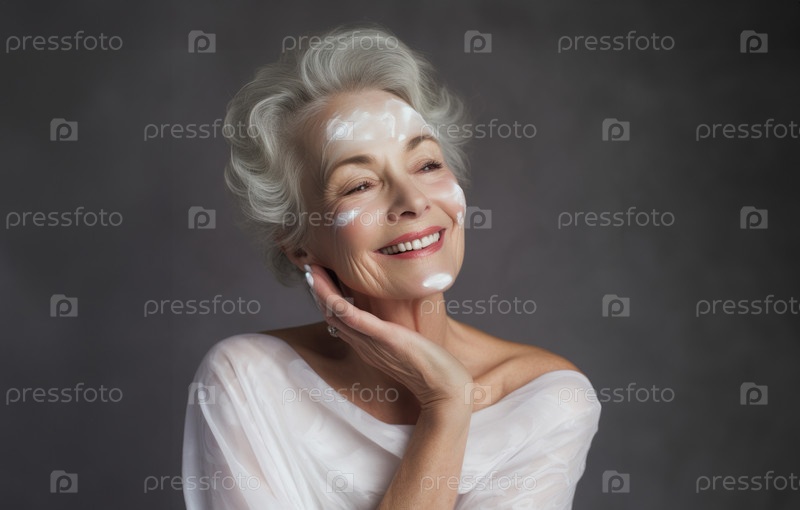 Пожилая женщина наносит крем на лицо, изящно выполняя процедуру ухода за кожей