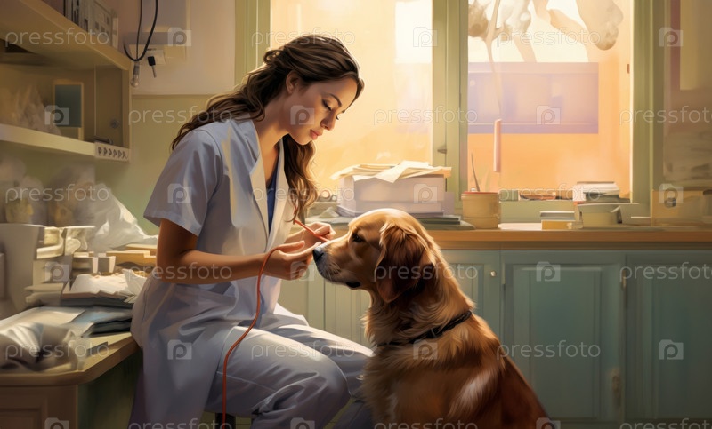 В залитой солнцем ветеринарной клинике преданный своему делу ветеринар нежно заботится о собаке, создавая теплую и благоприятную обстановку для ее благополучия