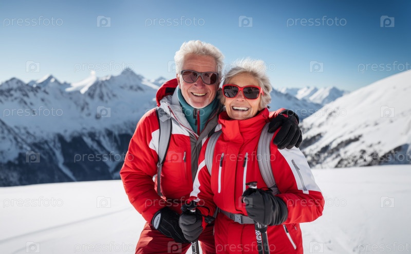 Пожилая пара в горнолыжном снаряжении разделяет трогательный момент, наслаждаясь радостью зимы и непреходящим теплом своей альпийской любви.Сгенерированное изображение