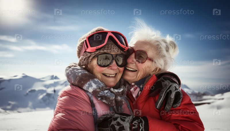 Две пожилые женщины в горнолыжном снаряжении трогательно обнимаются на заснеженной вершине горы