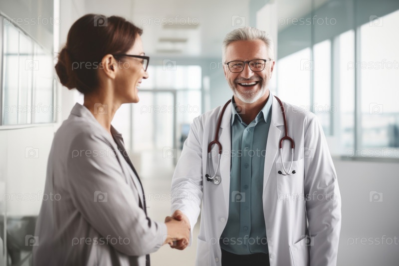 В коридоре современной больницы врачи обмениваются рукопожатиями, что свидетельствует о профессиональном единстве и сплоченной командной работе