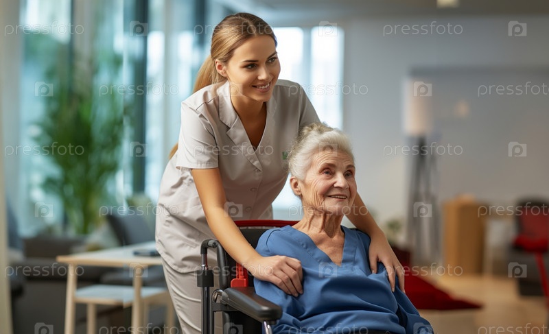 Сострадательная медсестра ухаживает за пожилым человеком в инвалидной коляске, оказывая ему специализированную медицинскую поддержку и комфорт
