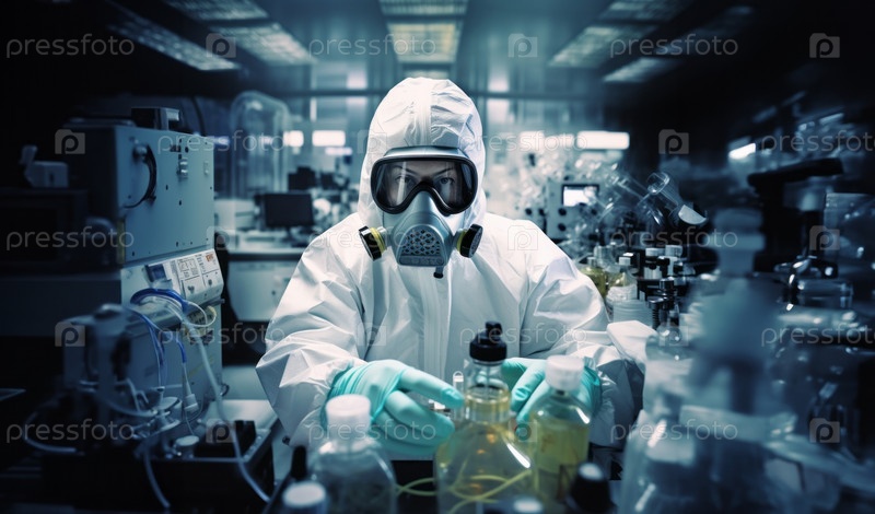 Таинственный доктор в костюме исследует опасные материалы с помощью микроскопа в профессиональной офисной обстановке