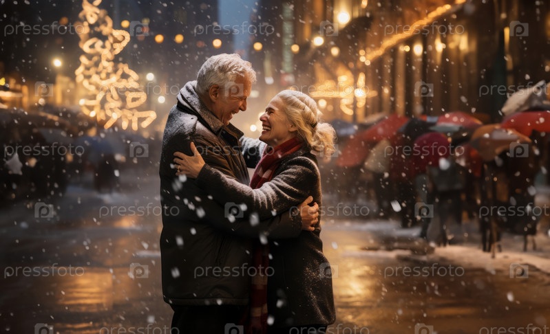 В безмятежном снегопаде пожилая пара сердечно обнимается, окутанная теплым сиянием любви в зимнюю ночь