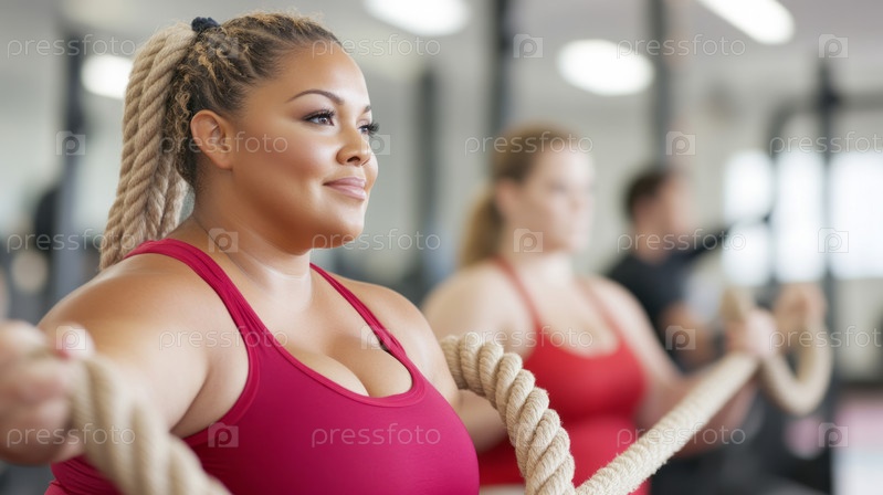 Женщина plus size сосредоточена на тренировках с канатами в спортзале, демонстрируя силу и решимость. Сгенерированное изображение