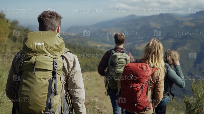 Группа друзей отправляется в поход к вершине горы со снаряжением. Сгенерированное изображение