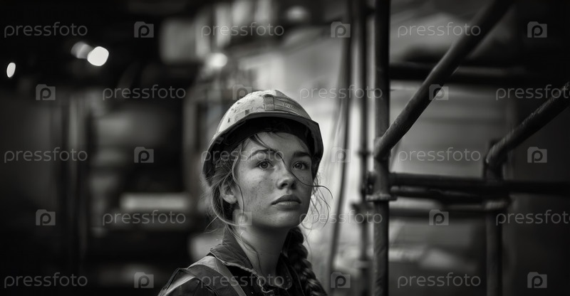 Портрет молодой женщины-инженера в защитном снаряжении, работающей на строительной площадке.Сгенерированное изображение