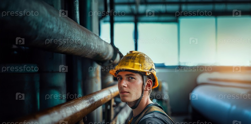 Молодой рабочий, работающий с большими трубами на строительной площадке.Сгенерированное изображение