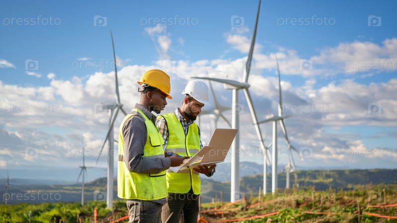 Инженеры используют цифровые технологии для контроля технического обслуживания ветряных турбин.Сгенерированное изображение